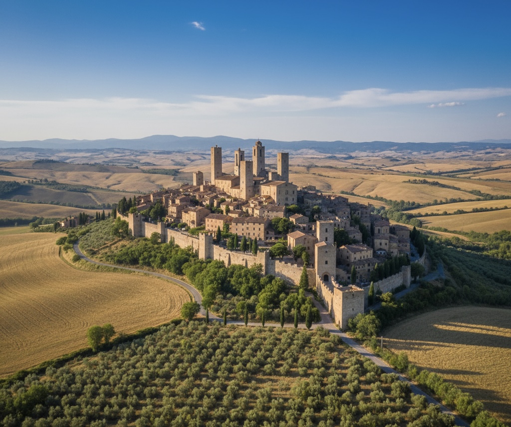 ✔️Desayuno. Partimos hacia la increíble ciudad de San Gimignano, una joya medieval rodeada de colinas y viñedos. Se alza sobre una colina de 324 metros sobre el nivel del mar. Fue declarada Patrimonio de la Humanidad. Famosa por sus torres de piedra, conserva un casco histórico lleno de arte y encanto. Sus calles empedradas, plazas armoniosas y vistas al valle del Elsa evocan la belleza y serenidad del pasado toscano. Acompañados de un guía local, recorreremos rincones inolvidables, como el Palazzo del Popolo, la Colegiata o la Iglesia de San Agostino.